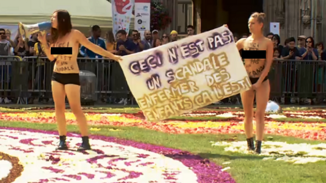 Активистки с обнаженной грудью держали в руках плакат с надписью «Скандал не это, а помещение детей в тюрьму». Такая же надпись была и на их телах, а на спинах была надпись «Позор Бельгии». При этом она из них объясняла присутствовавшим на площади людям свои действия в мегафон.