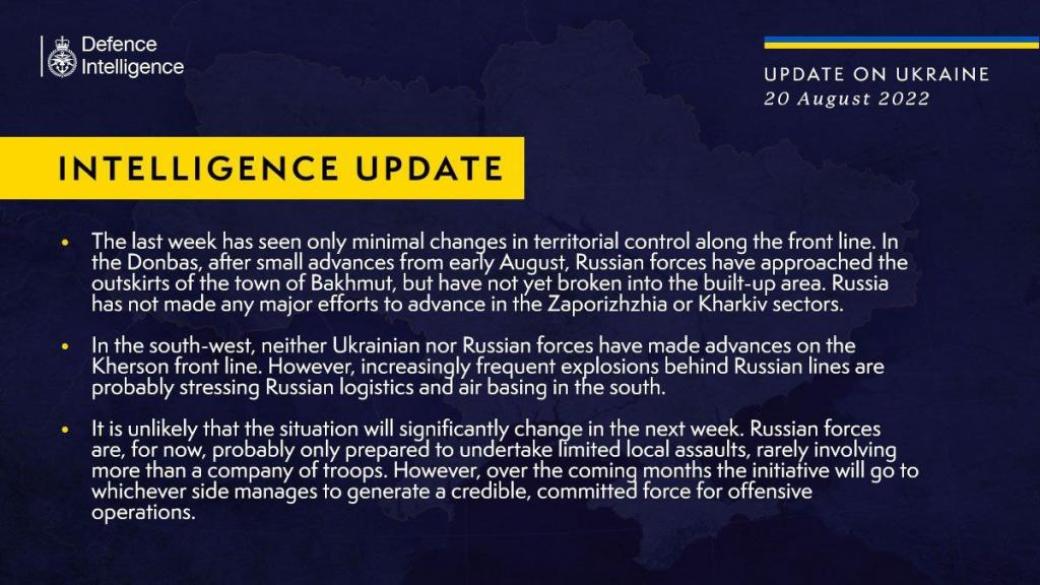 Аналитики в Британской разведке отмечают, что за последнюю неделю произошли лишь минимальные изменения с точки зрения контроля территорий вдоль линии фронта. В Донбассе, после небольших успехов, достигнутых в начале августа, российские силы приблизились к окраинам Бахмута, но пока не прорвались в сам город.