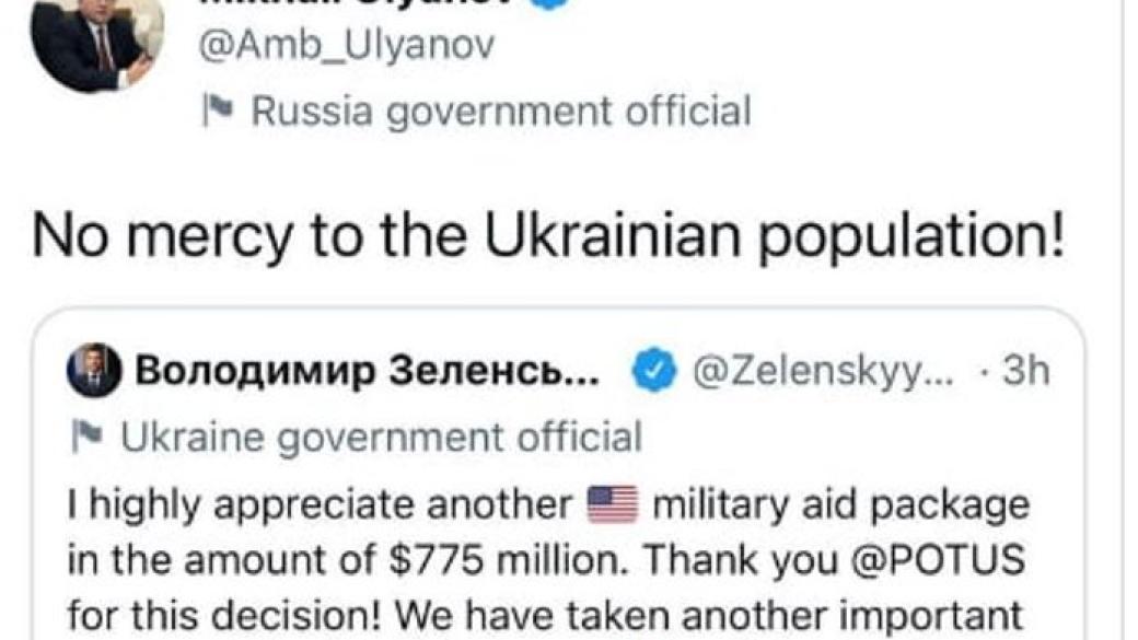 Постпред РФ при международных организациях в Вене Михаил Ульянов в своем Twitter, комментируя пост Зеленского, пригрозил - «никакой пощады украинскому населению».
