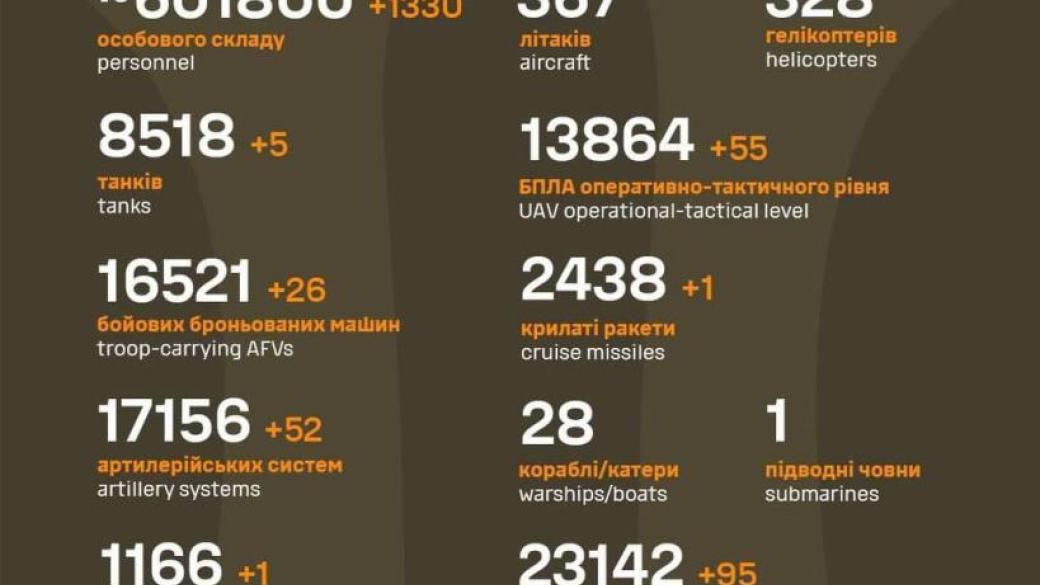 За минувшие сутки Силы обороны обезвредили 1330 российских захватчиков, 1 средство ПВО и более 250 единиц вражеской техники.