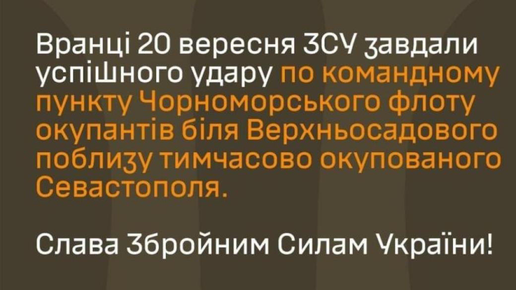 "Утром 20 сентября ВСУ нанесли успешный удар по командному пункту Черноморского флота оккупантов возле Верхнесадового".