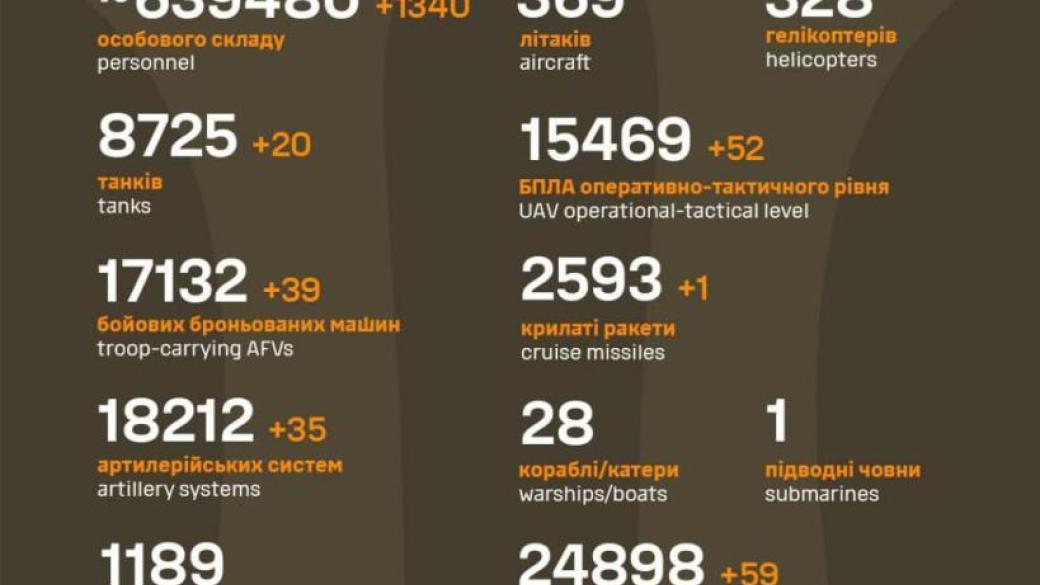 За минувшие сутки Силы обороны Украины уничтожили 1340 оккупантов и более 200 единиц вражеской техники.