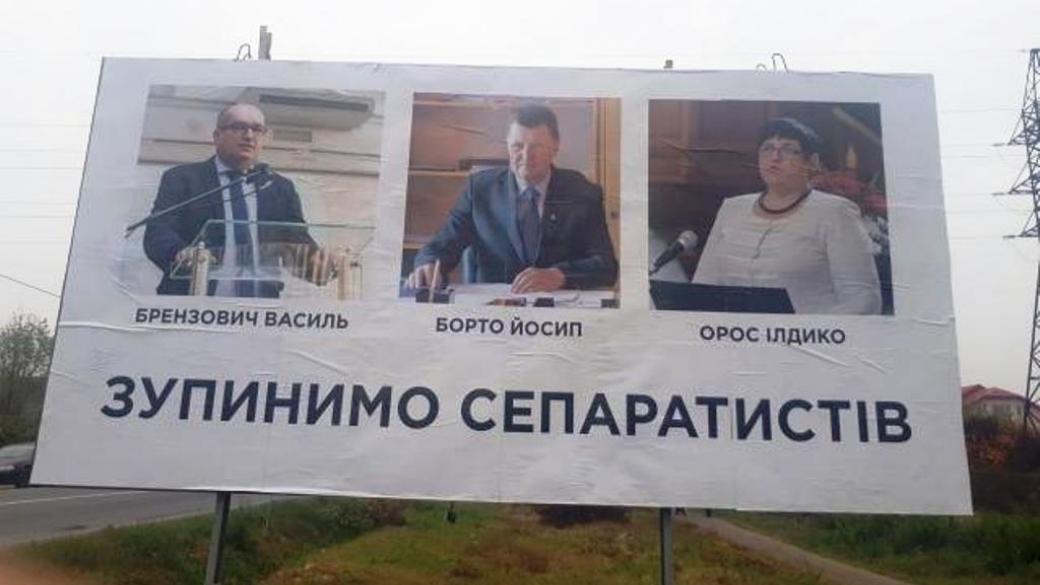 Сегодня в нескольких районах Закарпатской области появилисьрекламные щиты с изображением трех лидеров Общества Венгерской культуры Закарпатья и надписью: «Остановим сепаратистов».Такую информацию сообщает местное издание mukachevo.net.