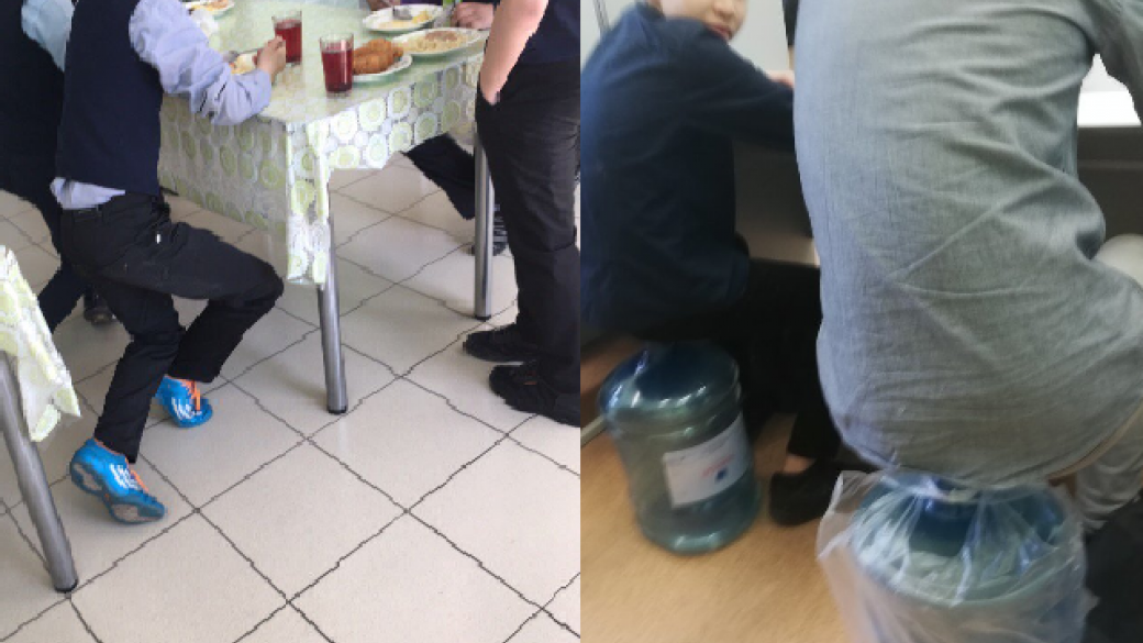 На снимках видно, что некоторым школьникам не хватило ни стульев, ни бутылок и они пытаются принимать пищу стоя или вприсядку.