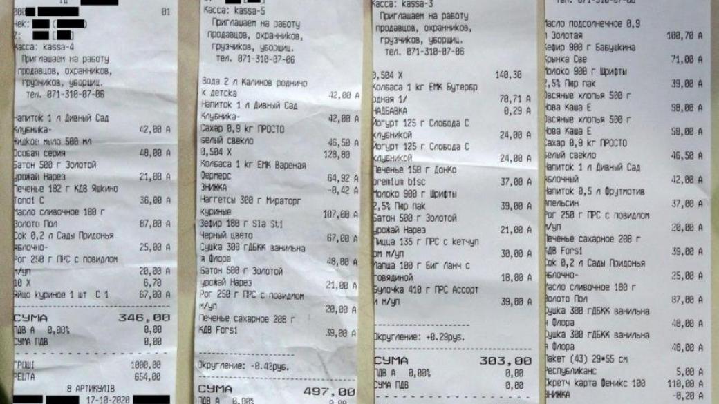 «На сахар цена держится стабильно после недавнего повышения — 44−48 рублей за пачку в 900 граммов (еще месяц назад она стоила 34−39 рублей). Кое-где начали дорожать и яйца — примерно на 10−12 рублей за десяток. Более подробно о ценах на фото. Чеки из „Первого республиканского супермаркета“ за 17, 18, 19 и 20 октября».