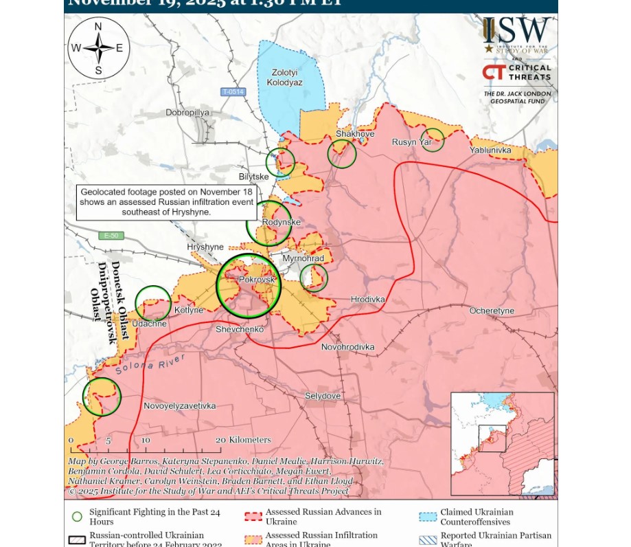ВСУ затрудняют использование техники и перемещение личного состава армии рф в пределах города Покровска Донецкой области, что влияет на темпы российского наступления и с начала ноября продвижение оккупантов замедлилось. Об этом пишут специалисты Института изучения войны.