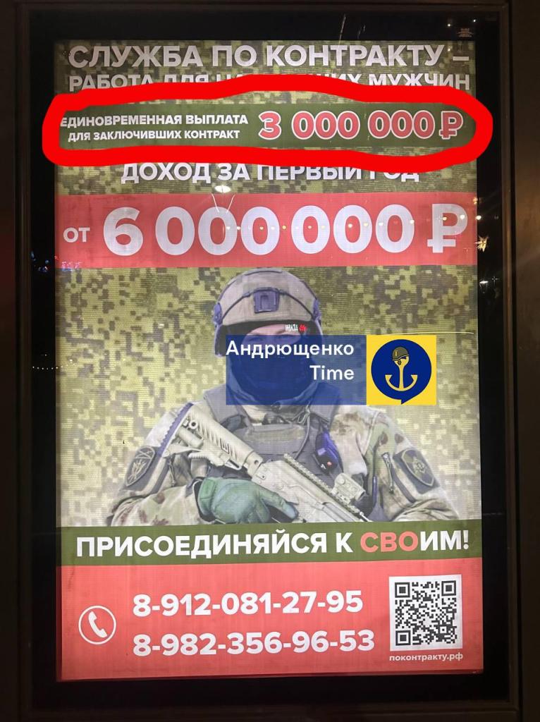 "Но это средние данные. Мы видим, что в ноябре начался новый этап роста цены за "голову". Свежее фото из Челябинска. Здесь тоже уже подняли до 3 млн рублей разовую выплату, но в статистику еще не попало. Это еще раз демонстрирует растущий кризис рекрутинга и нарастая проблемы россии с "пушечным мясом"".