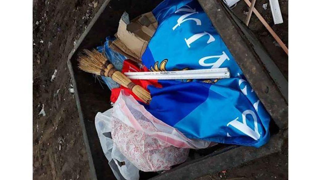 В оккупированном Алчевске Луганской области проукраинские патриоты сорвали со здания местной стоматологии и выбросили на помойку флаг «ЛНР».