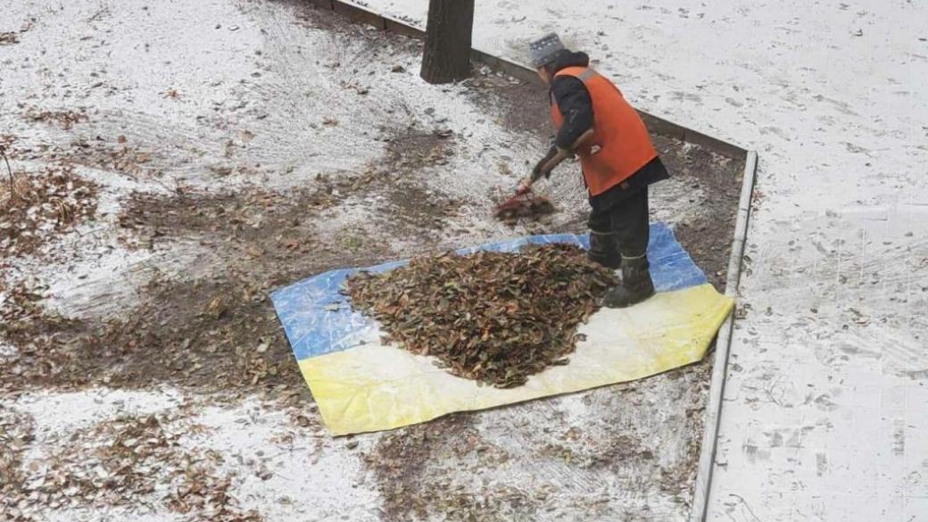Офицер ВСУ Александр Штефан «Штирлиц» в своем Телеграмм-канале опубликовал фото из неподконтрольного Украине Донецка на котором показано, как местный дворник сметает опавшую листву в украинский флаг.