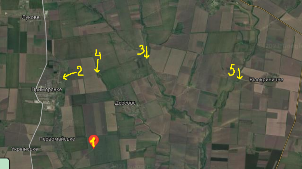 — лесополоса между с. Дерсовое — с. Белокриничное (на фото цифра 5. Подробные снимки этих мест по ссылке).