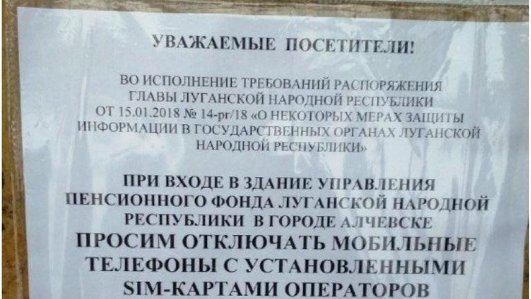 Отмечается, что на дверях в отделениях «пенсионного фонда» на временно оккупированной части Луганской области появились объявления, запрещающие людям входить в здание при наличии sim-карт украинских операторов.