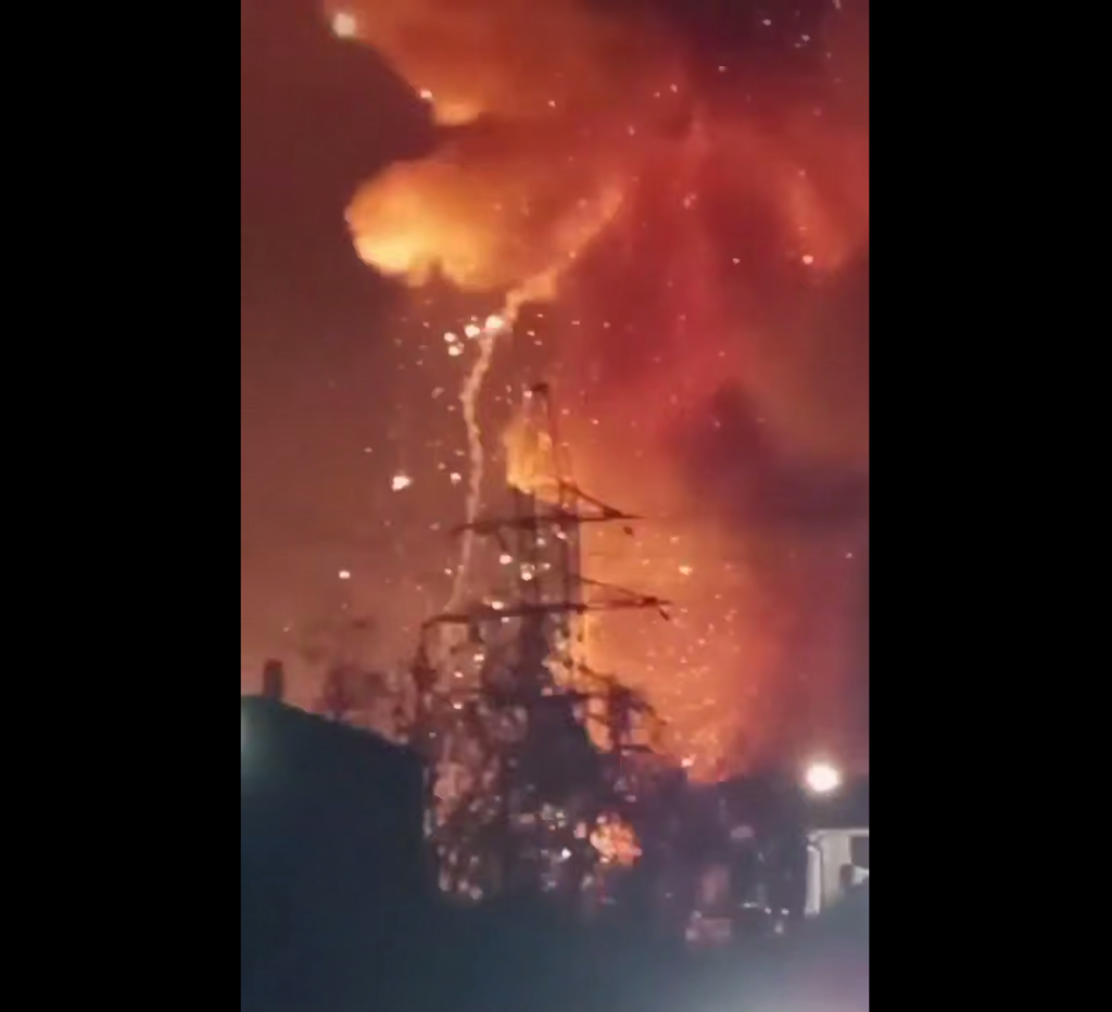 Судя по опубликованным видео, на складе возник пожар и началась детонация БК.
