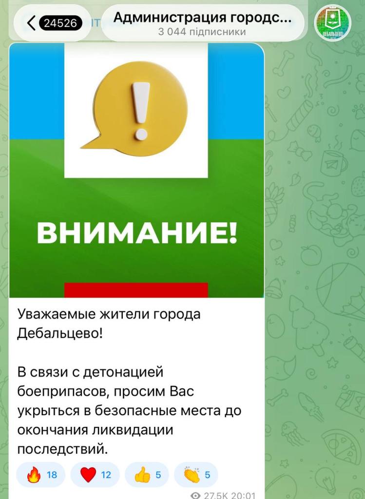 «Мэр» Дебальцево Сергей Желновач подтвердил, что в городе детонируют боеприпасы, а также попросил жителей укрыться в безопасных местах.