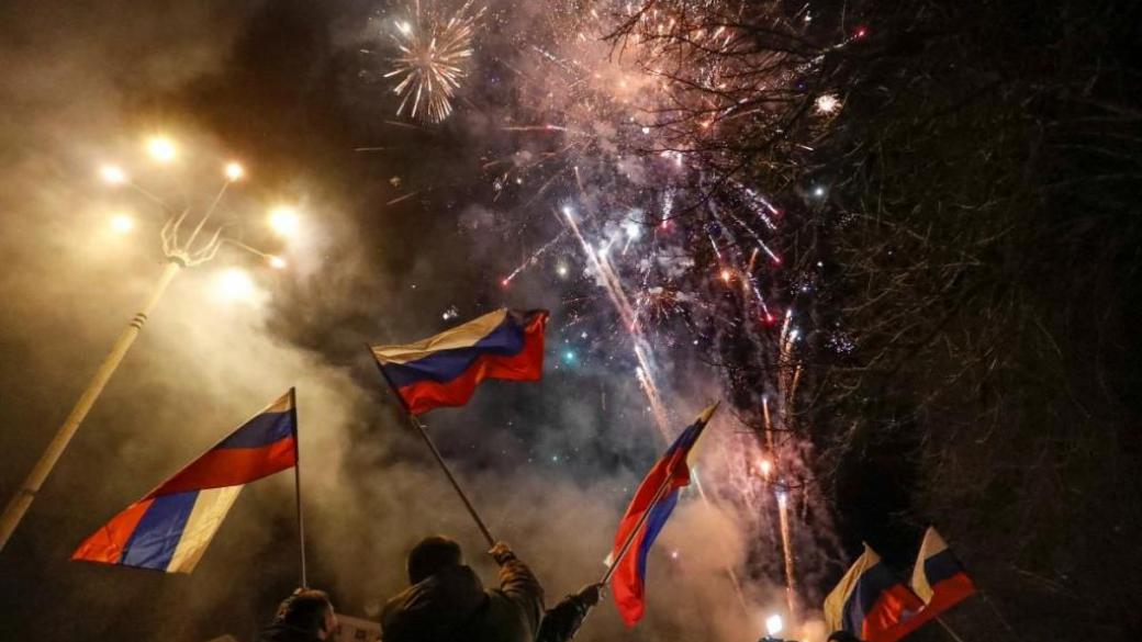 По данным очевидцев, «празднующих» людей немного — их несколько десятков. Они держат в руках флаги России. Часть «празднующих» устроили кратковременный салют. Участники акции распивают алкоголь.