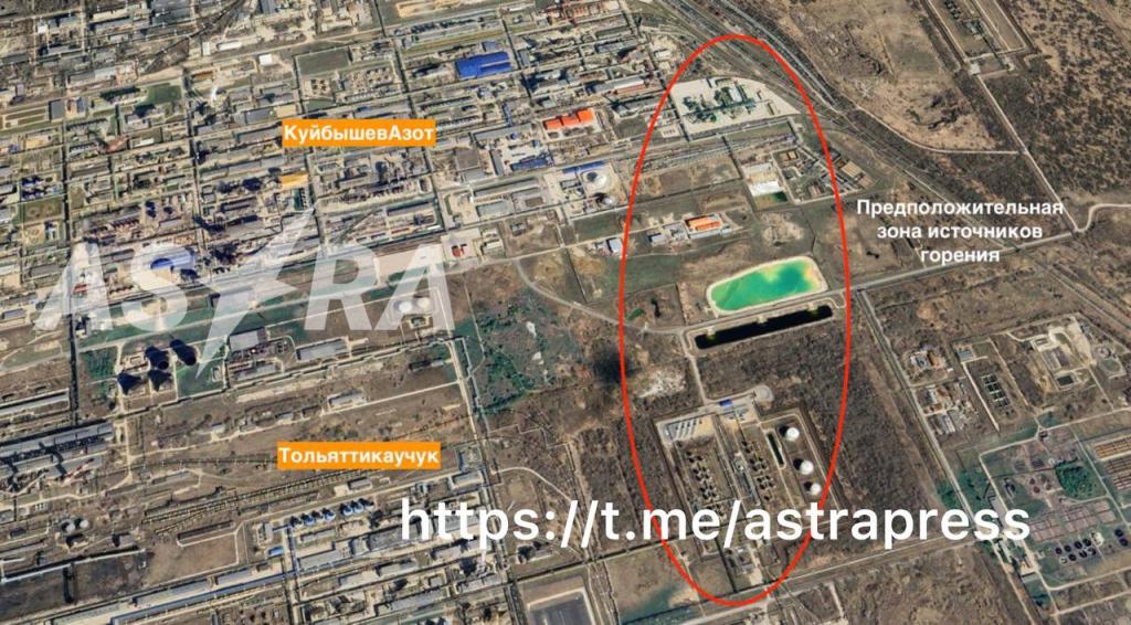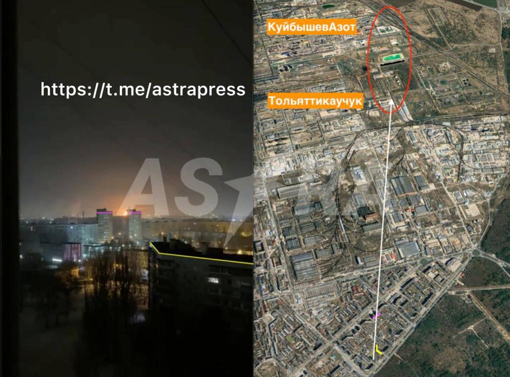 "Согласно анализу ASTRA кадров очевидцев, пожар возник в районе двух, расположенных недалеко друг от друга, химических предприятий — "Тольяттикаучук" и "КуйбышевАзот".