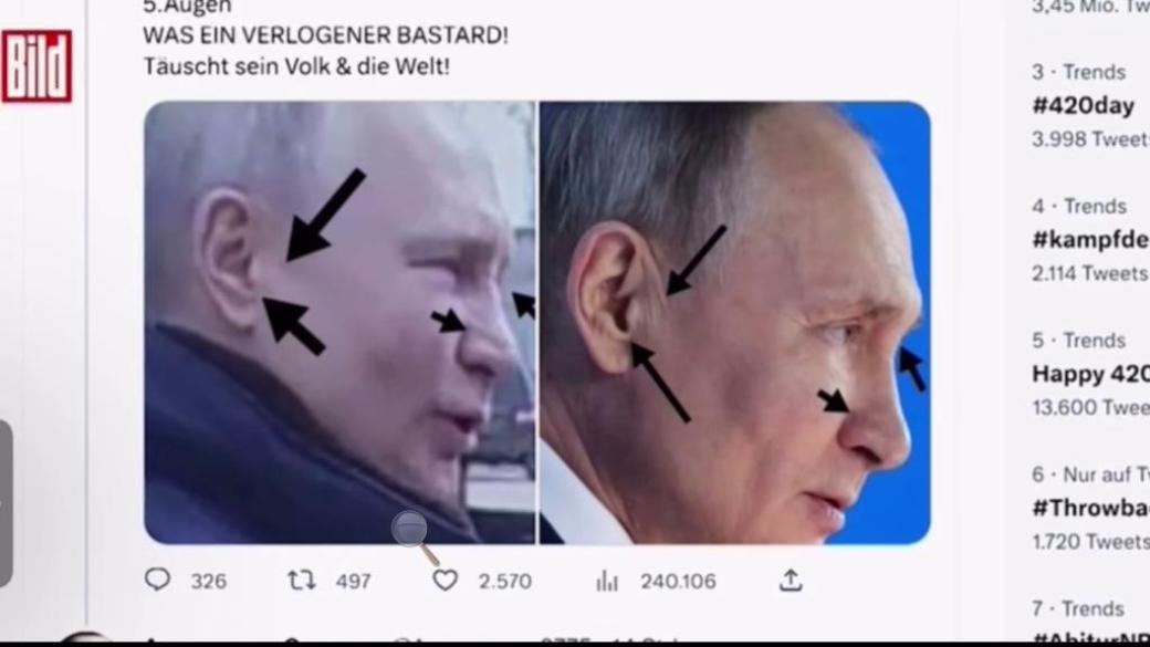 Журналист издания BILD Питер Тиде решил разобраться в том, как и где власти РФ используют двойников российского президента. Сопоставив кадры публичного появления российского диктатора, Тиде отмечает основные несходства в образах.