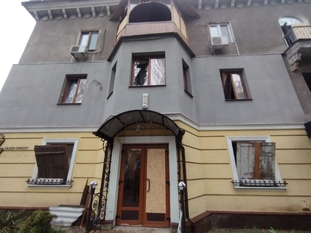 В Славянске разрушена школа, повреждены по меньшей мере 18 многоквартирных и три частных дома, четыре магазина, аптека и т.д.