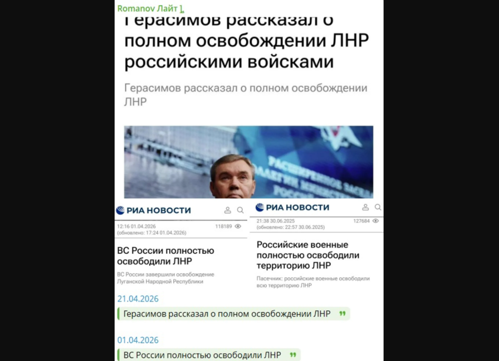 На канале "Аналитика. Новости" отметили, что аналогичное заявление о «полном освобождении лнр» звучало 1 апреля, а перед этим — еще четыре раза: 2 октября 2025 года (высказался путин на Валдае), в начале 2022 года (также путин), в октябре 2022 года (глава оккупационной администрации "ЛНР" Леонид Пасечник). На это также обратили внимание Z-блогеры рф, которые опубликовали скриншоты с соответствующими заявлениями росСМИ, говорится в заметке.