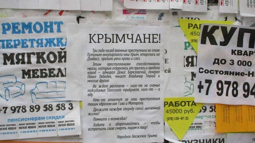 В листовках указано, что предателей ждет расплата. Данное обращение составлено от «Народного движения Крыма».