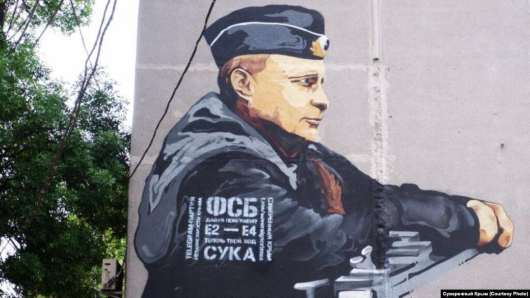 На мурале с изображением российского президента Владимира Путина в оккупированном Симферополе появилось послание: «ФСБ, давай поиграем? Е2-Е4. Теперь твой ход, с*ка»». Об этом сообщают «Крым. Реалии».