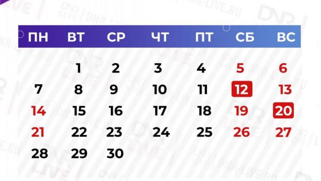 Так, согласно «указу» «главы ДНР» Дениса Пушилина праздничными нерабочими днями в ДНР считаются: — День России (12 июня) — Троица (20 июня). При совпадении праздничных или нерабочих дней с выходным днем выходной день переносится на следующий рабочий день.