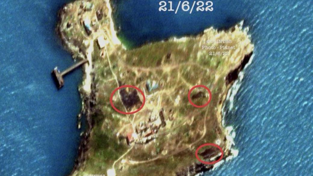 Специалисты из группы OSINT-88 опубликовали спутниковый снимок захваченного войсками РФ острова Змеиный, на котором видны три выгоревших после обстрела ВСУ участка. Соответствующие спутниковые снимки компании Planet Labs опубликованы на их странице в соцсети.