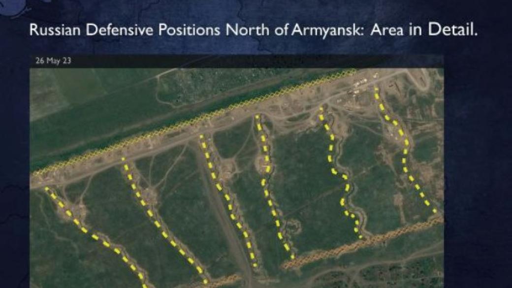 На опубликованных фотографиях видно, что укрепления расположены в 3,5 км к северу от города Армянск, на узком перешейке, соединяющем полуостров с Херсонской областью. Протяженность укреплений – 9 км.