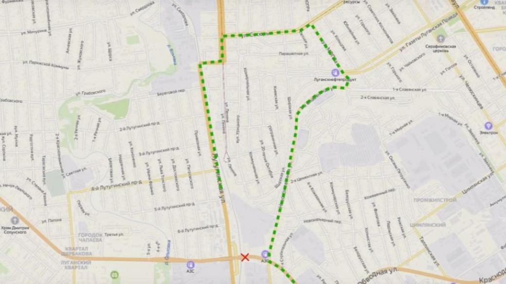 «Грузовым транспортом объезд осуществляется по улицам Руднева, Мадридской и Лутугинской. Легковой и пассажирский транспорт осуществляет объезд по улицам 4-й Лутугинский проезд, Лутугинская, 2-й Ракетный переулок, улице Руднева либо по улицам Сосюры, МОПРа и Новокожевенной. Пассажирский транспорт также может объезжать по улице Петровского», — сказано в сообщении.