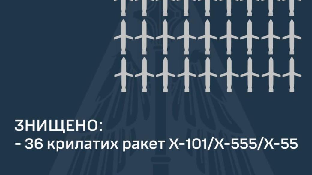 В результате боевой работы силами и средствами Воздушных Сил во взаимодействии с ПВО Сил обороны уничтожены 36 крылатых ракет.