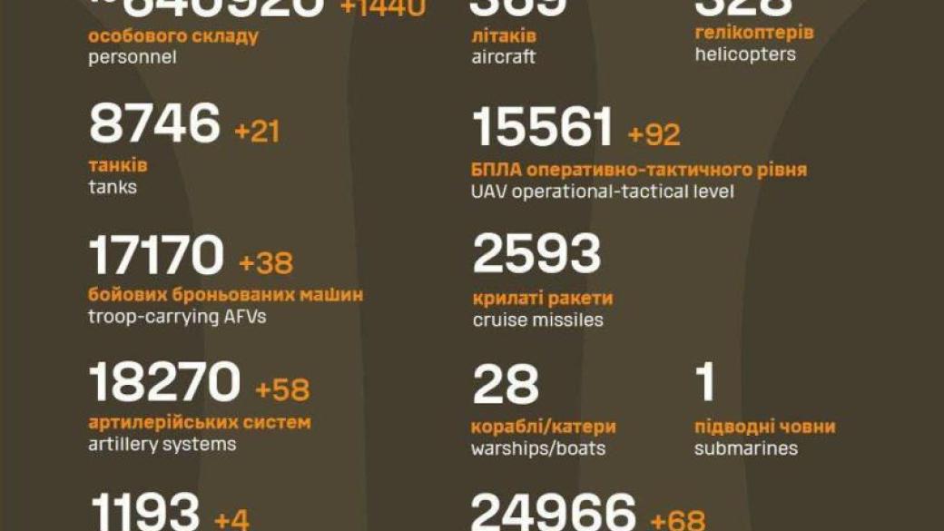 За прошедшие сутки защитники Украины ликвидировали 1440 захватчиков и практически 300 единиц вражеской техники.