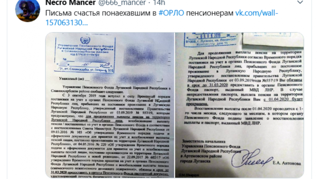 По словам очевидцев, некоторыми пенсионерам, уже стоящим на учете в «пенсионном фонде ЛНР» и получающим пенсии, грозят прекратить выплаты с 1 апреля 2020 года, если те не получат и не предоставят «пенсионному фонду республики» «документ». Ресурс пишет: