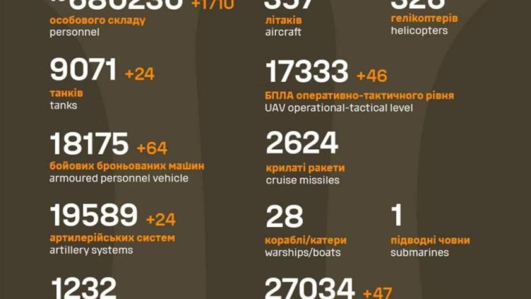 За минувшие сутки украинские защитники ликвидировали 1 710 оккупантов и более 200 единиц вражеской техники.