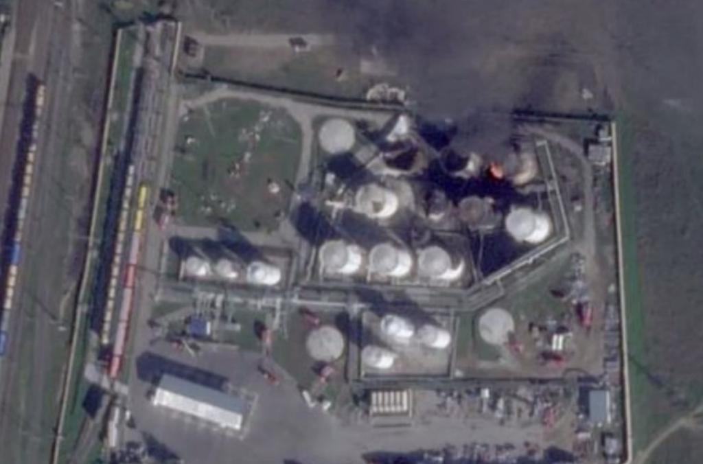 На спутниковом снимке 21 октября видно, что как минимум пять резервуаров сгорели, а территория базы получила значительные повреждения.