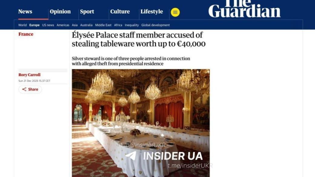 Из резиденции президента Франции Елисейского дворца украдены предметы национального наследия — столовое серебро и фарфор. Об этом сообщает The Guardian.