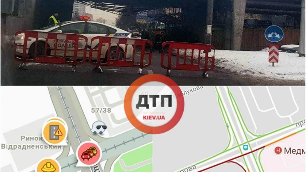Портал dtp.kiev.ua. сообщает, опасный участок перекрыла полиция, в результате чего образовалась километровая пробка: «Вслед за Лепсе: декоммунизируется мост через Комарова, путепровод на В. Гавела. Обрушилась часть конструкций».