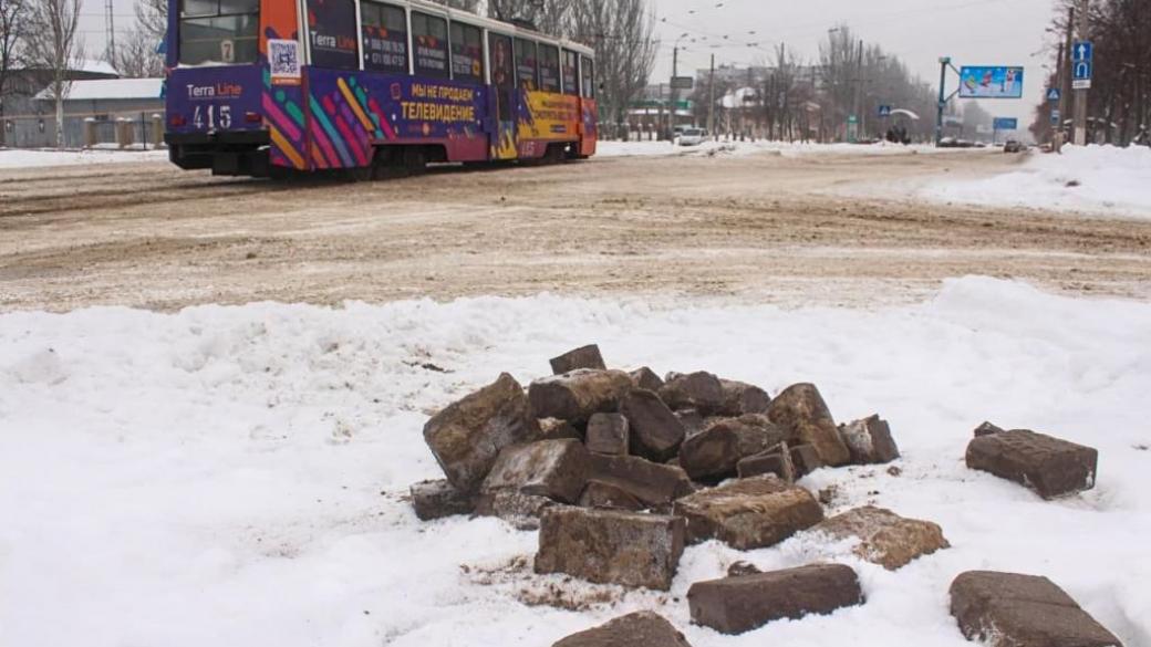 «Резкий скачок температуры не прошел даром для дорожного покрытия. На фото — пересечение проспекта Ленина и бульвара Димитрова. Трамвайные пути. Первые „ласточкины жертвы“ оттепели — ФЭМ-брусчатка, которой тут несколько лет назад укладывали переезд», — пишет блогер.