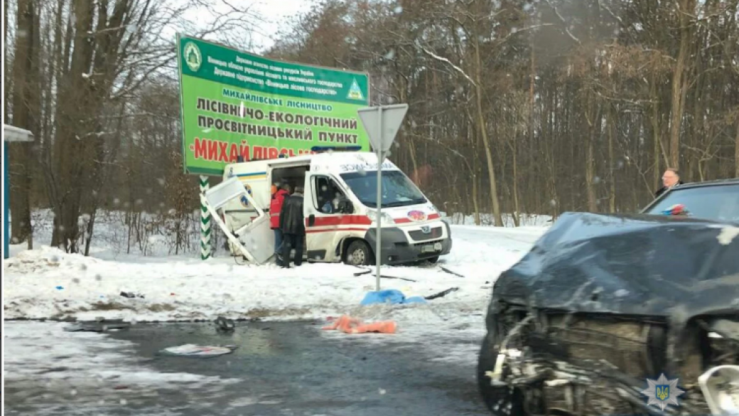 В Нацполиции сообщили, что сегодня около 08:00 на автодороге Житомир — Могилев-Подольский вблизи Сосенки столкнулись «ВАЗ 21099», Reno, Mercedes и автомобиль скорой помощи.