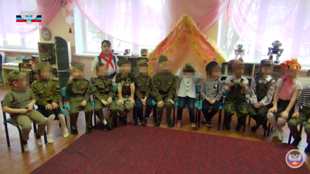 Детей детского сада «Аленка», расположенном в неподконтрольном Украине Донецке, организовали поздравлять с 23 февраля членов НВФ «ДНР». Соответствующее видео опубликовано «министерством информации республики».