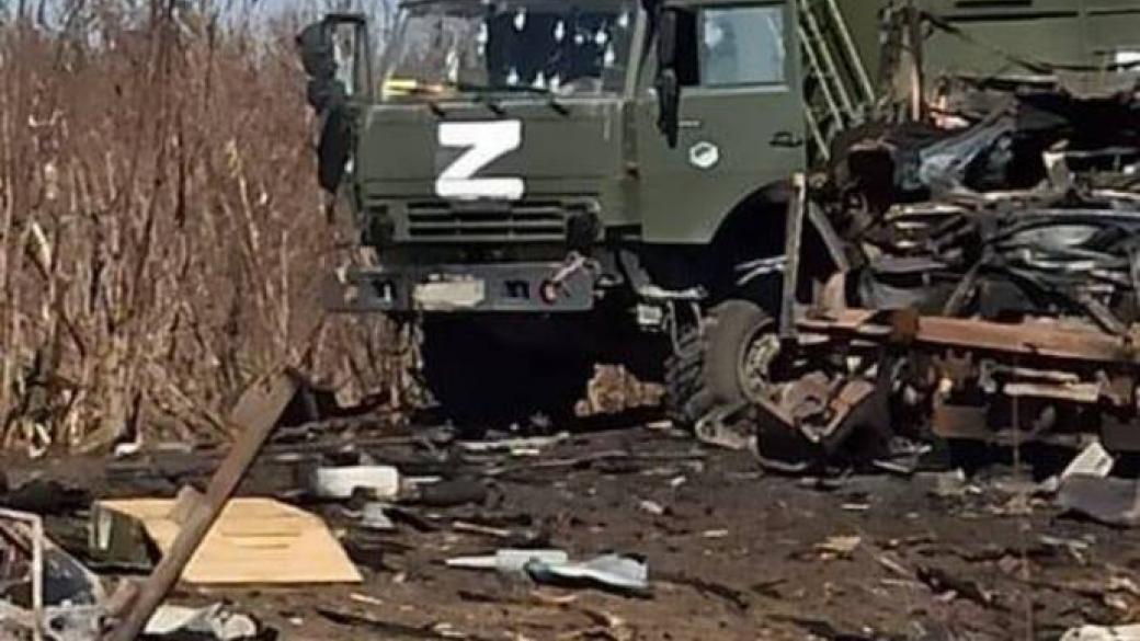На фото — место боя и уничтоженный украинскими бойцами российский грузовик.