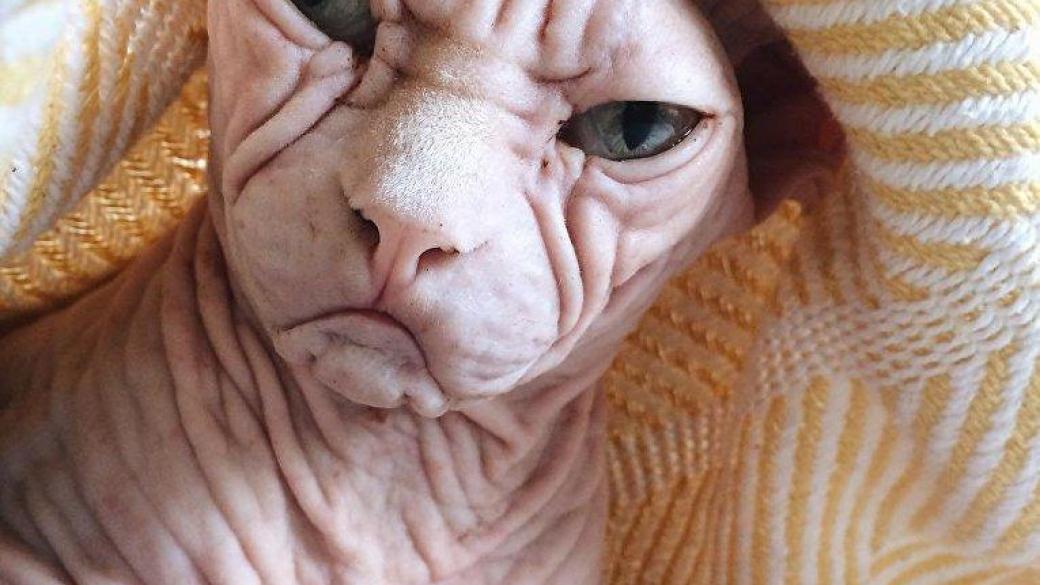 Кот по кличке Локи породы сфинкс живет с хозяевами Сарой и Брентом в Нью-Йорке.