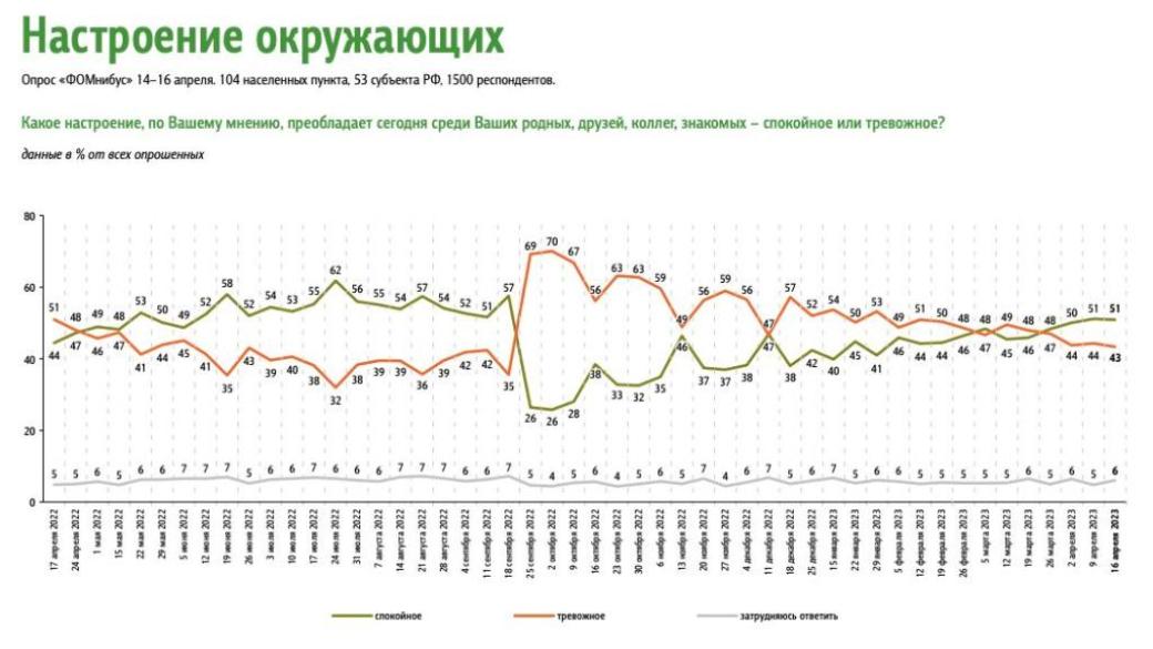 Опубликован график уровня тревожности россиян из которого чётко видно, почему Кремль всеми правдами и неправдами оттягивает процесс мобилизации предпочитая скрытую её форму или как сейчас, вкладывается в рекламу контрактной армии, что называется оттягивая неизбежное.