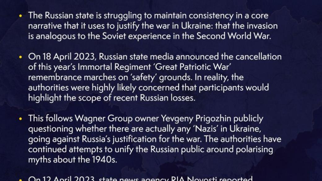 По данным британской разведки, 18 апреля в РФ объявили об отмене в 2023 году традиционных маршей памяти "Бессмертного полка" о Великой Отечественной "по соображениям "безопасности". Однако, в ведомстве подчеркнули, что на самом деле "власти РФ обеспокоены тем", что участники маршей обратят внимание на масштаб российских потерь в войне против Украины.