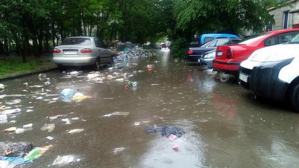 Вчера из-за сильного ливня во Львове затопило улицы, в результате чего потоки воды носили многочисленный мусор, который городские власти никак не могут вывезти.
