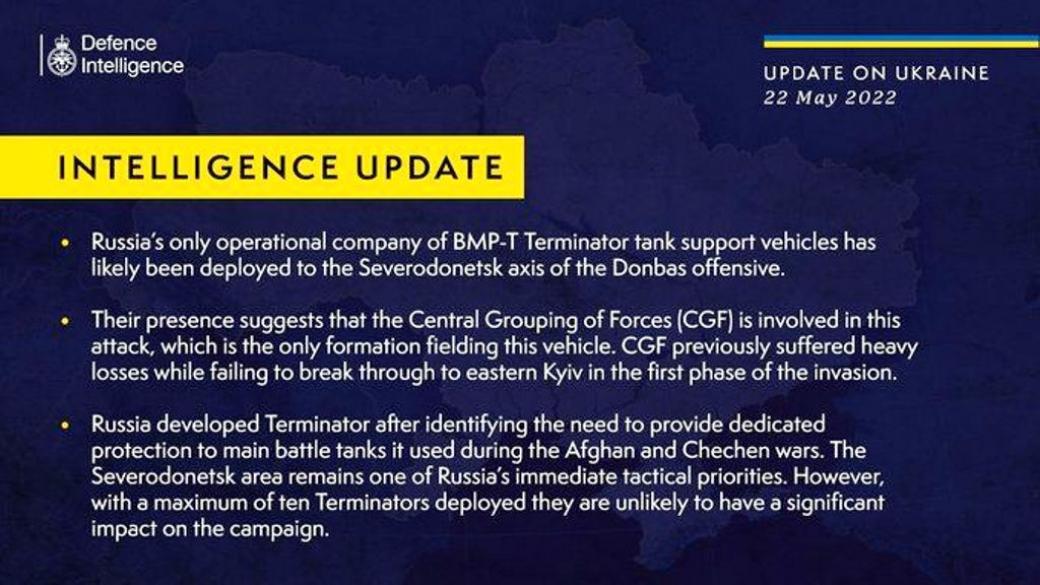 Единственная действующая в России рота машин поддержки танков БМП-Т «Терминатор» по предварительным данным, была переброшена на Северодонецкое направление для наступления на Донбасс. Об этом сообщает Минобороны Британии со ссылкой на британскую разведку.