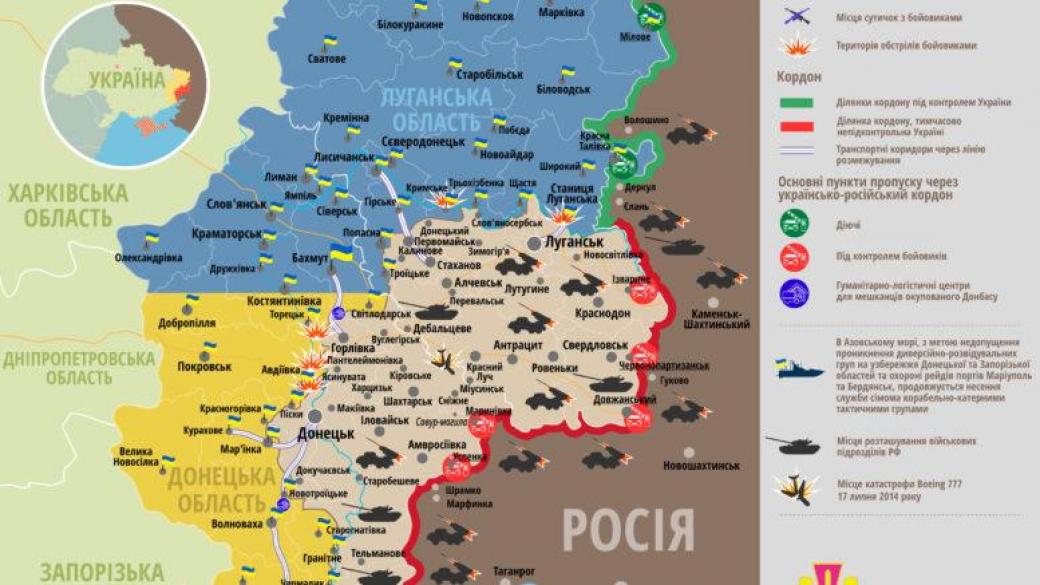 По данным спикера Минобороны по вопросам АТО Андрея Лысенко, на Луганском направлении боевики один раз нарушили режим тишины в Станично-Луганском районе, а также осуществили 3 обстрела в Крымском. При этом противник дважды применял минометы. Все эти инциденты произошли в светлое время суток.