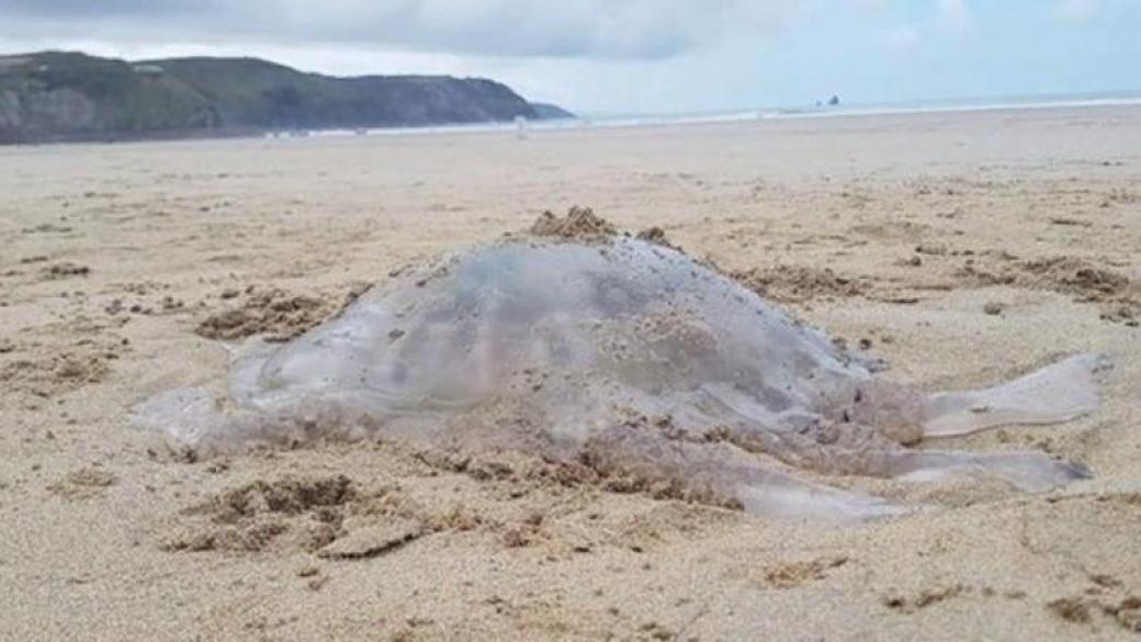 Жители Великобритании обнаружили выброшенную на берег огромную медузу размером с мусорный бак.