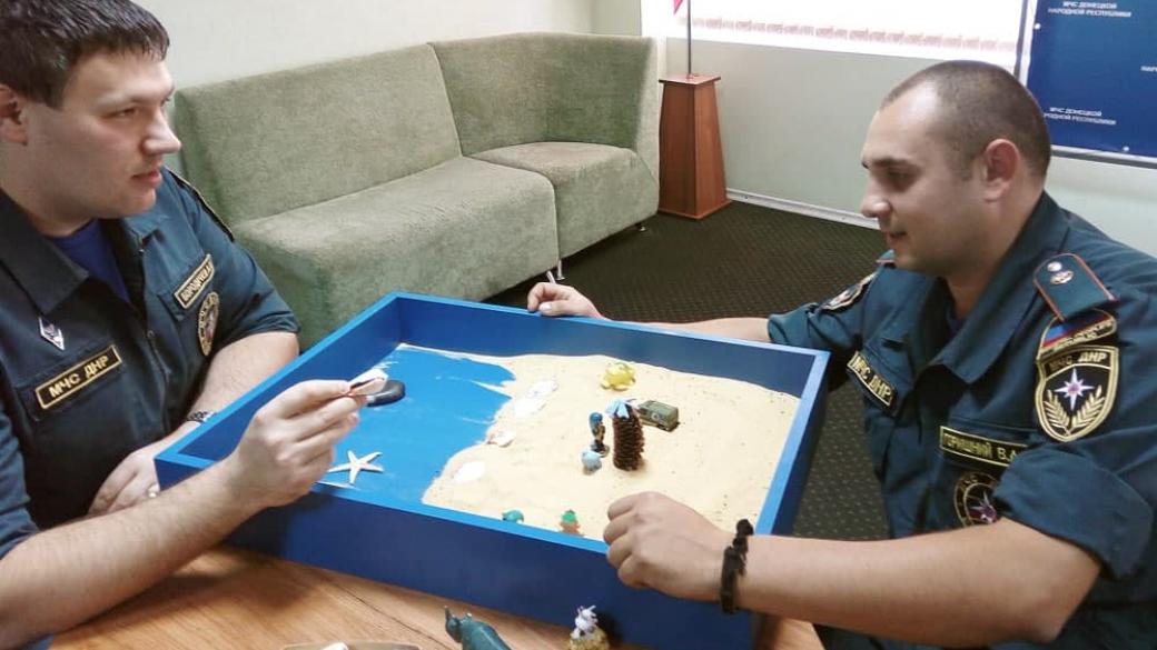 Местные паблики в соцсетях облетела фотография, на которой двое так называемых членов «МЧС „ДНР“» занимаются песочной терапией.