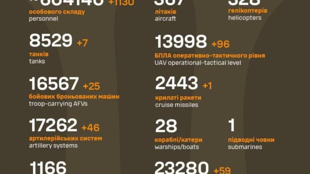 Силы обороны Украины за минувшие сутки ликвидировали 1130 оккупантов, 3 средства ПВО и более 250 единиц вражеской техники.