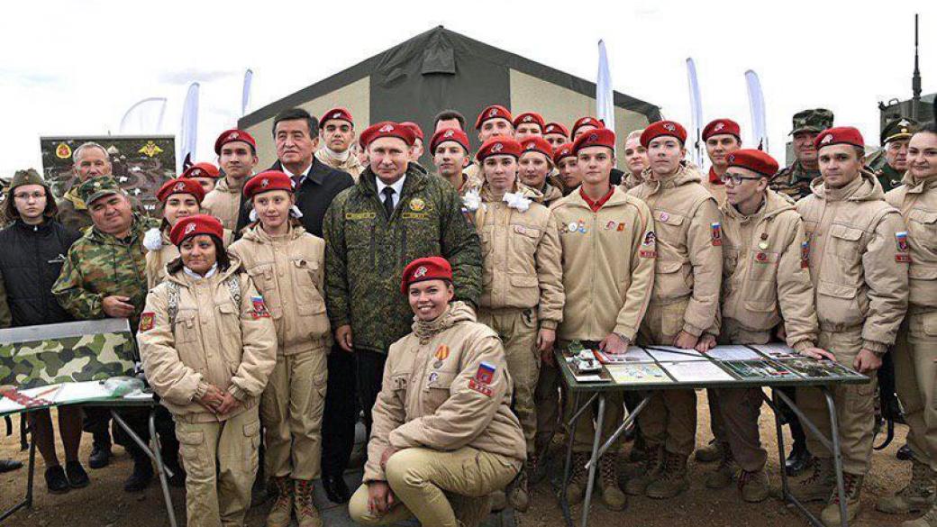 Президент России Владимир Путин в ходе встречи с президентом Кыргызстана Сооронбаем Жээнбековым посетили военные учения в Оренбургской области, где сфотографировался с «юнармейцами». Соответствующее фото опубликовал в своем Telegram-канале украинский политолог Алексей Голобуцкий.