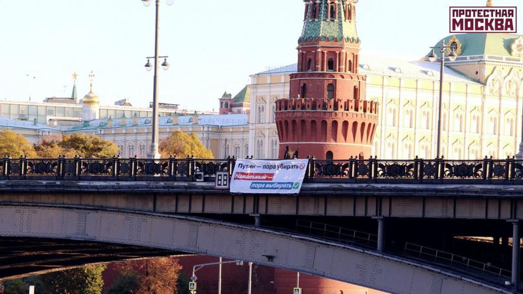 Фото данного баннера опубликовала на своей странице «Протестная Москва». Так, на баннере сказано: «Путин — пора убирать. Навальный — пора выбирать».
